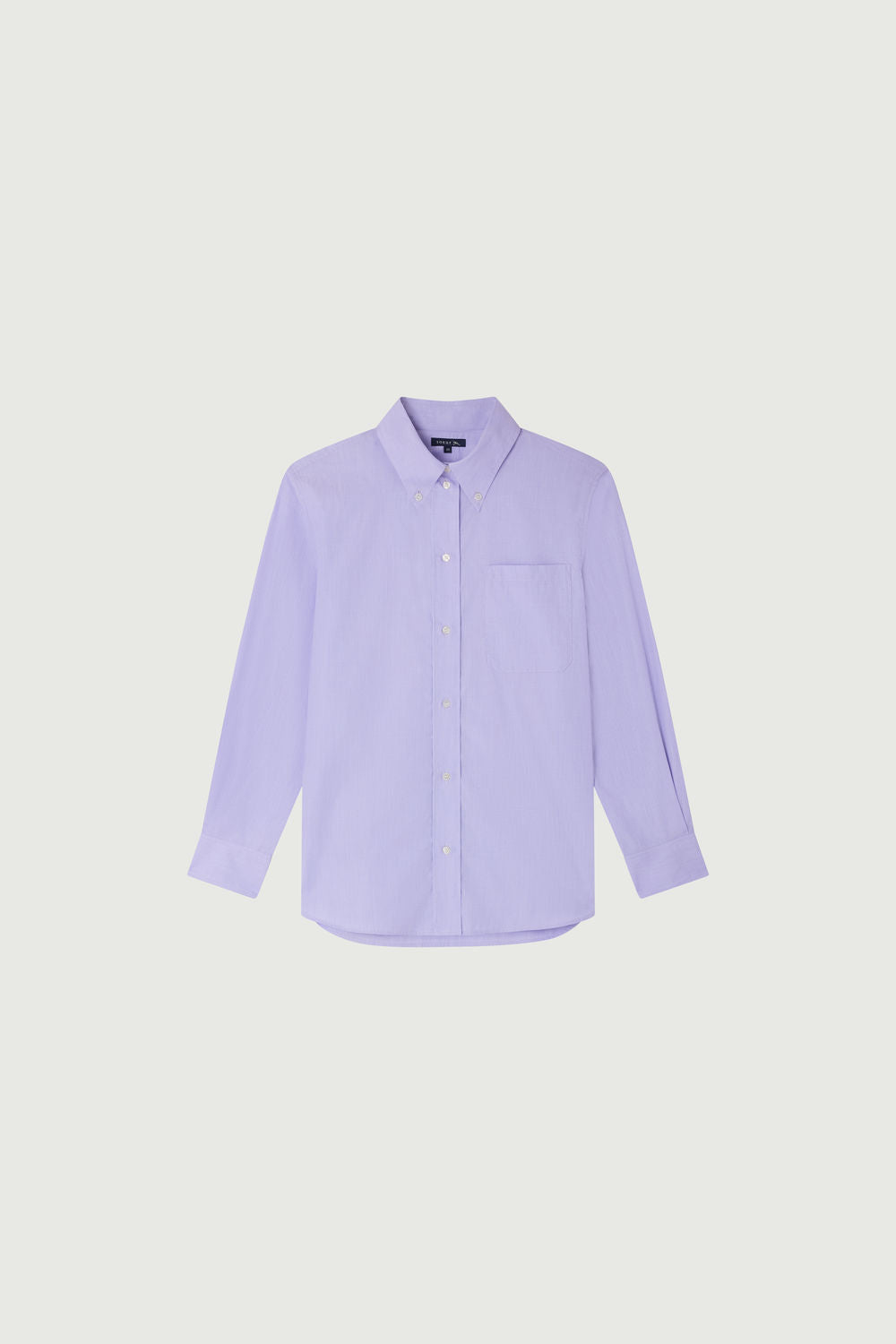 MARIA est une chemise en coton fil à fil . Elle dispose d'un col chemise d'homme, d'une ouverture boutonnée devant, d'une poche plaquée sur la poitrine, et d'un bas en forme de liquette pour une touche moderne.
