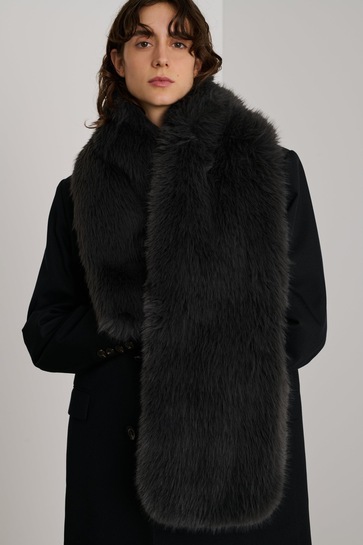 RUBY est une écharpe en fausse fourrure. D'une couleur anthracite foncé, au poil volumineux, ce col se porte par-dessus une veste de blazer ou chemise pour réchauffer une tenue d'hiver.