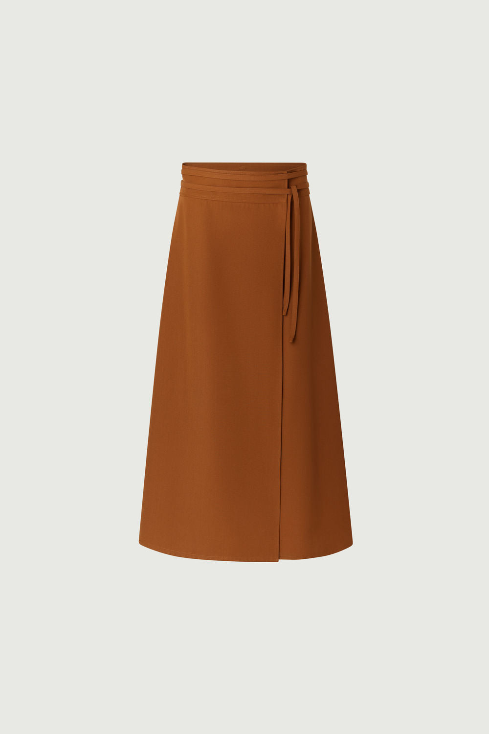 REINE est une jupe porte-feuille à volume trapèze qui offre une silhouette flatteuse avec sa taille haute et sa longueur mi-mollet. La gabardine de laine assure à la fois confort et raffinement, faisant de cette jupe un choix idéal pour ajouter une touche de sophistication à vos tenues de saison.