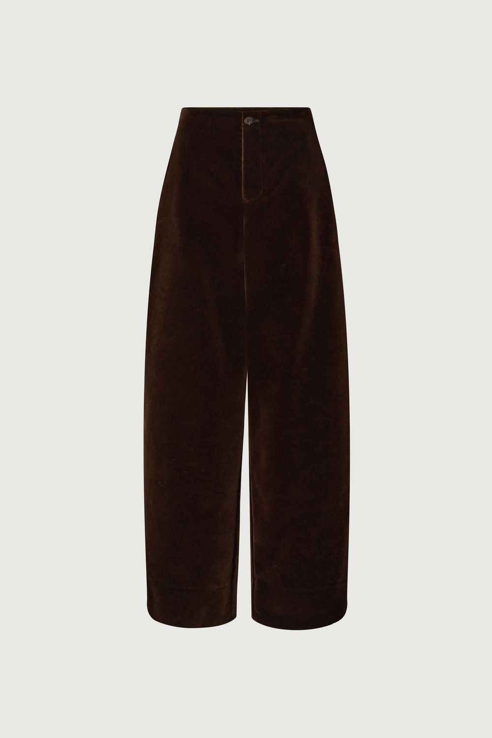 CELESTIN est un pantalon taille haute légèrement évasé. Sa coupe minimaliste, sans ceinture ni pinces, s'adapte à toutes les morphologies. Le velours lisse met en lumière sa teinte marron chocolat brillante.