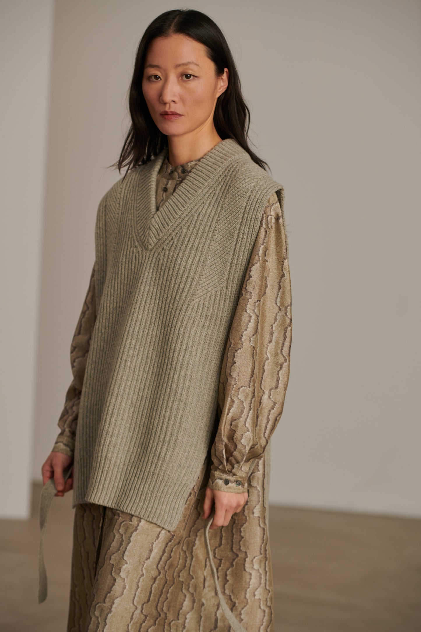 COSTA est un plastron droit, tricoté dans un fil de laine vierge. Rendu visuel par un effet de côtes, des liens sur les côtés se portent ceinturés pour marquer la taille, ou laissés suspendus. Un vêtement idéal pour réchauffer une tenue, tel une robe en soie ou une chemise liquette en coton.