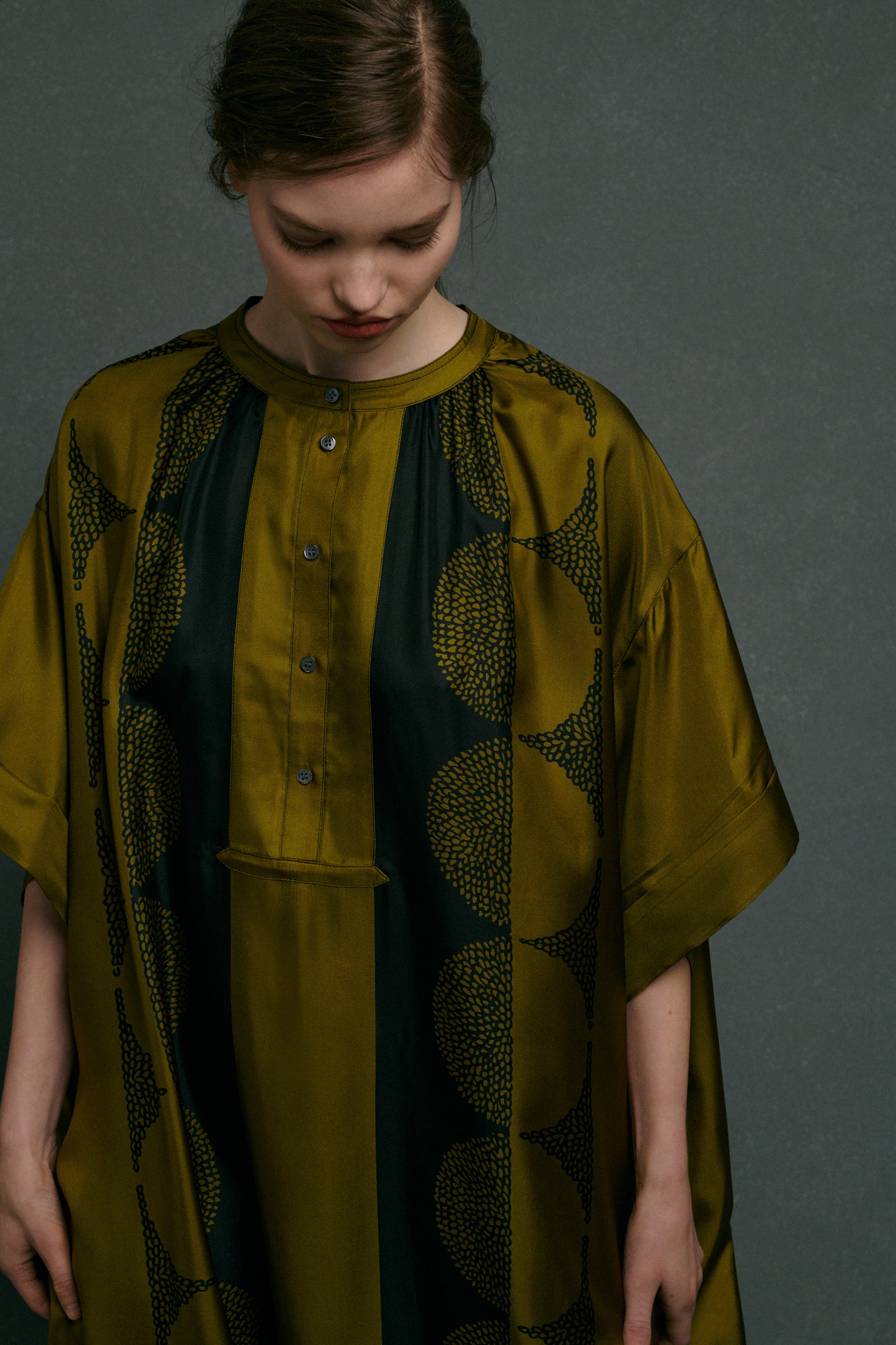 Robe longue à manches courtes en twill de soie imprimé "Pochoir" kaki/noir