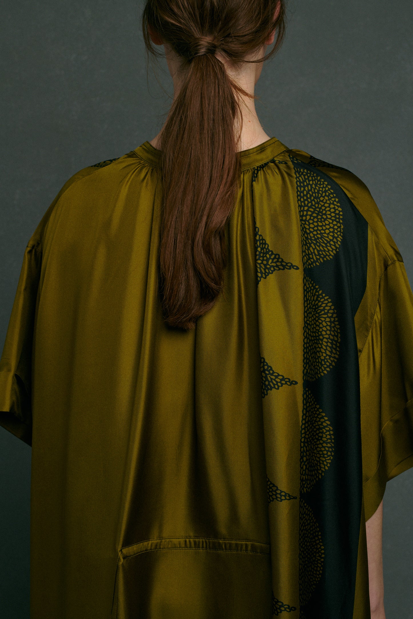 Robe longue à manches courtes en twill de soie imprimé "Pochoir"