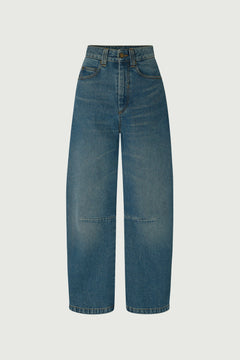 AGATHA est un blouson en toile de denim épaisse, assouplie grâce à un lavage qui conserve sa couleur dense bleu indigo. Sa coupe sans doublure est boxy et courte. Ses brandebourgs (fermetures à nœuds) et ses finitions gansées sont autant de détails inspirés des vêtements d'officier.